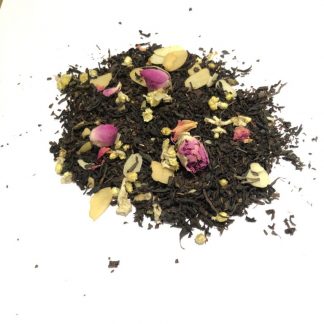 Grøn te, æblestykker, mandelskiver, citronskaller, koriander, pistaciekerner, rosa peber og kattepoteblomster.