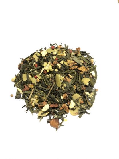 Grøn te, æblestykker, mandelskiver, citronskaller, koriander, pistaciekerner, rosa peber og kattepoteblomster. Sådan smager et vinter spektakel!