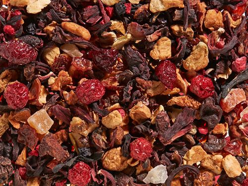 Æble, frysetørrede hindbær- og kirsebærstykker, solbær, blåbær, hyldebær, papaya, korinter og hibiscus. Lækreste frugtte varm som is-te.