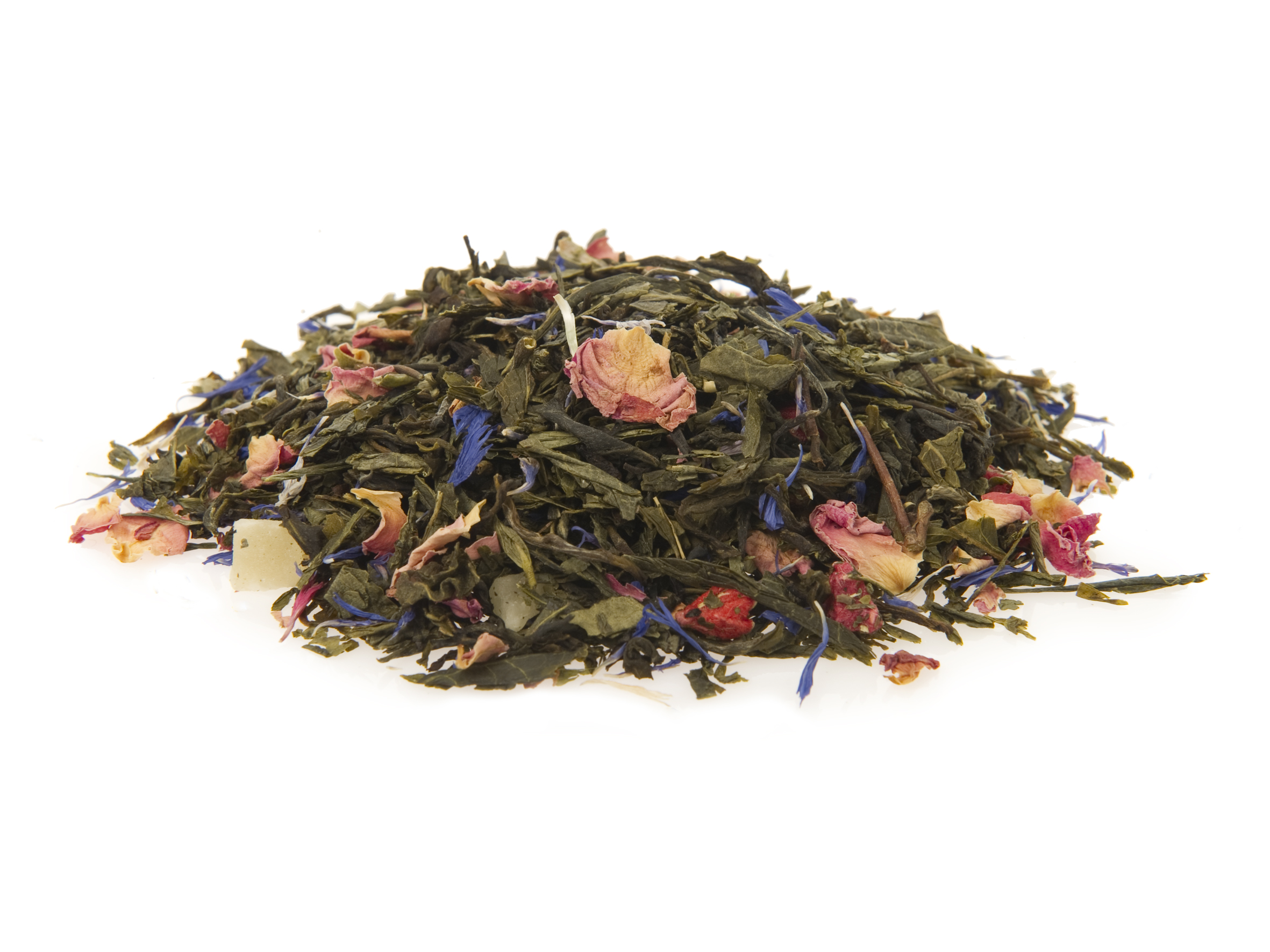 Grøn og hvid te fra Kina med ananas, jordbær, korn- og rosenblade. Også fantastisk til iste!