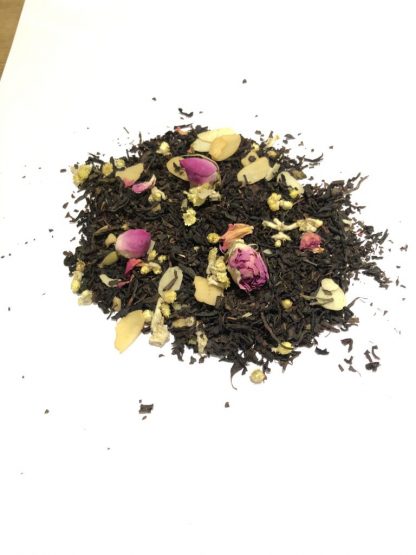 En usædvanlig lækker the med en vidunderlig marcipansmag. Sort the med mandlerstykker, rosen blade og -knopper, kattepoteblomster og naturlig aroma.